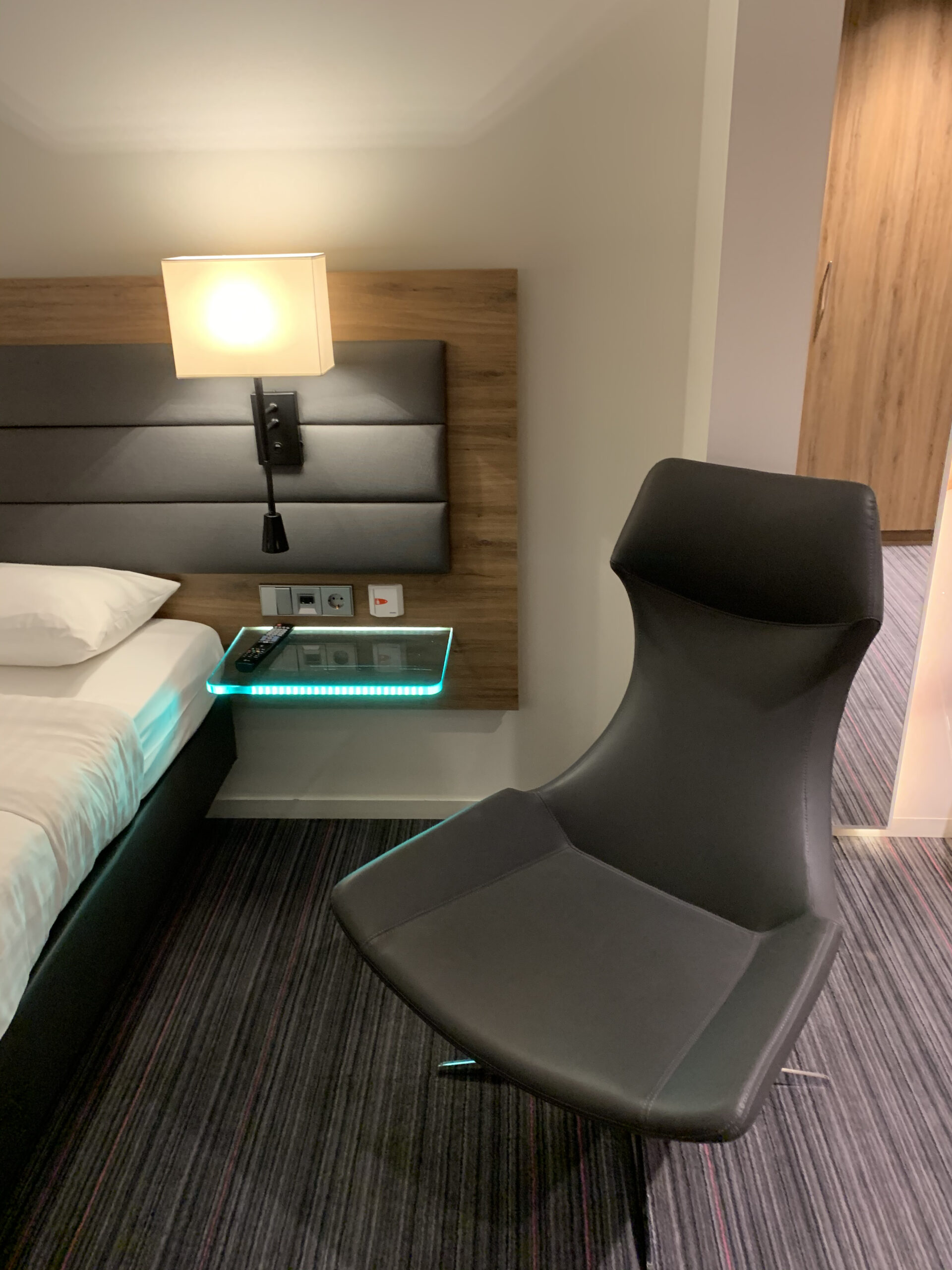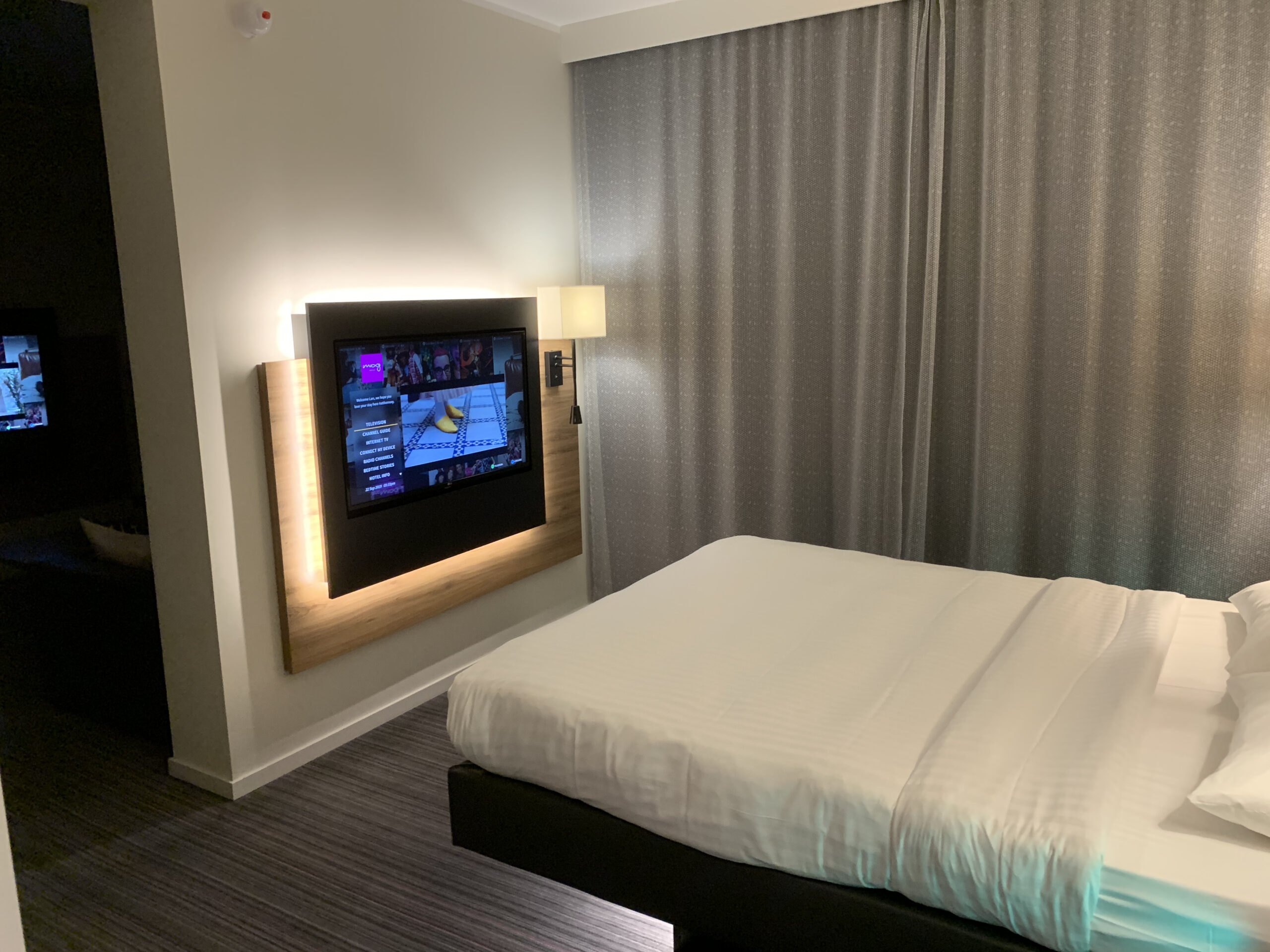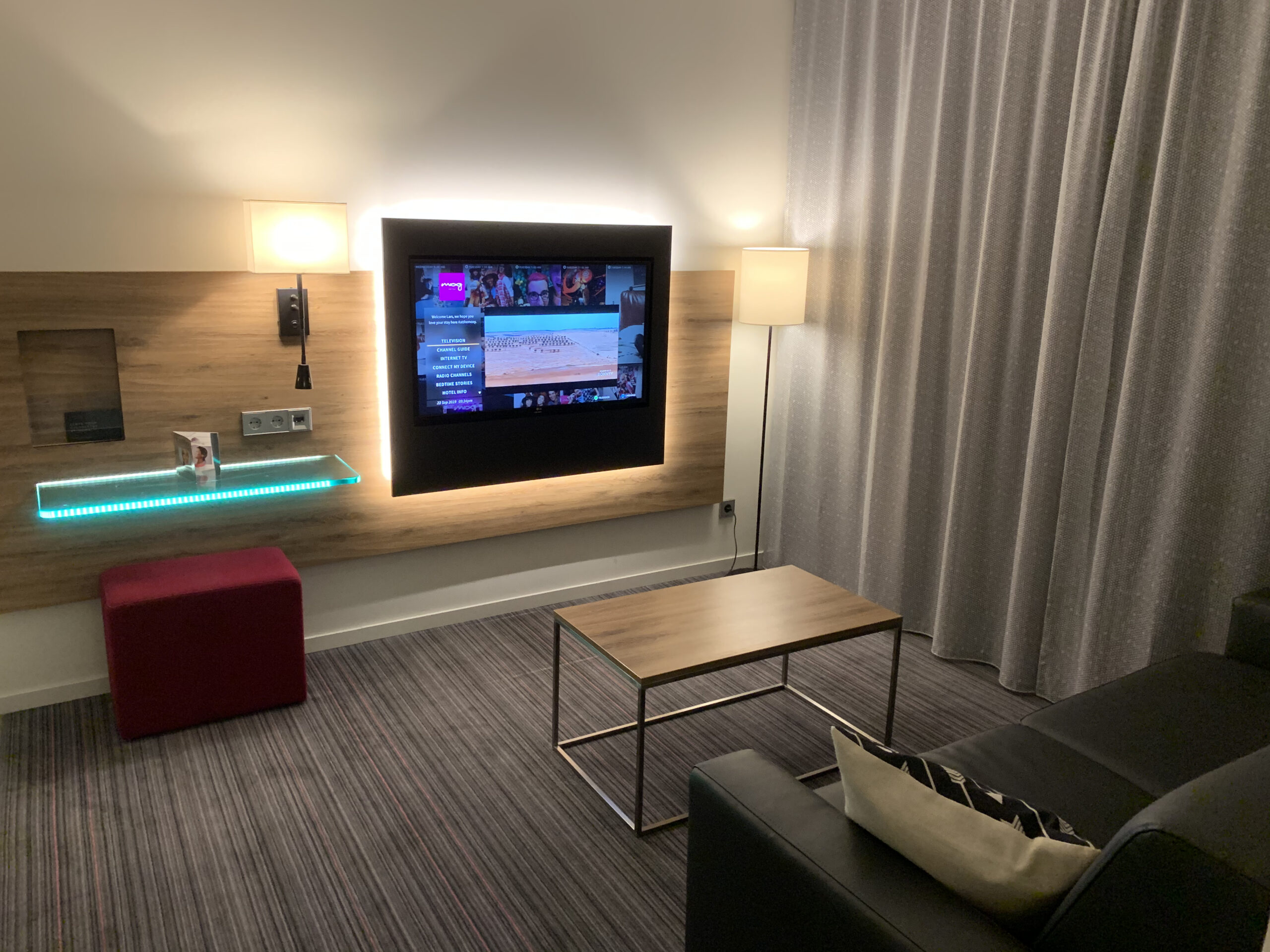 Das Bett ist durchaus bequem wenn auch eher auf der härteren Seite. Ich hatte das Glück aufgrund meines Status auf eine bessere Kategorie ein Upgrade zu erhalten, daher hatte ich noch eine separate Sitz und Fernsehecke welches direkt neben dem Badezimmer ist. Hier fällt dem Betrachter auf, dass es sich um ein behinderten gerechtes Zimmer handelt, daher gibt es keinerlei störende Vertiefungen oder Höhen.