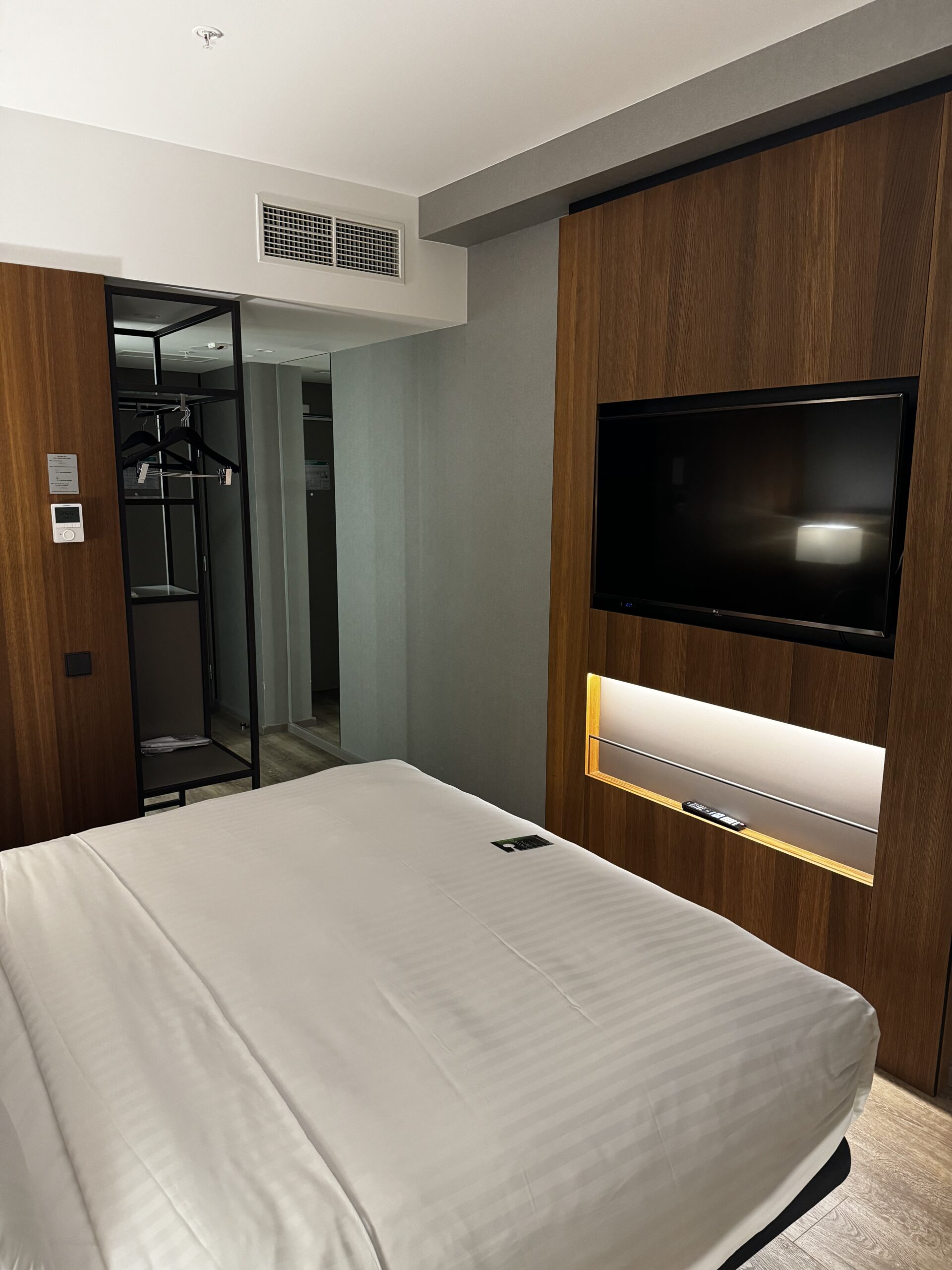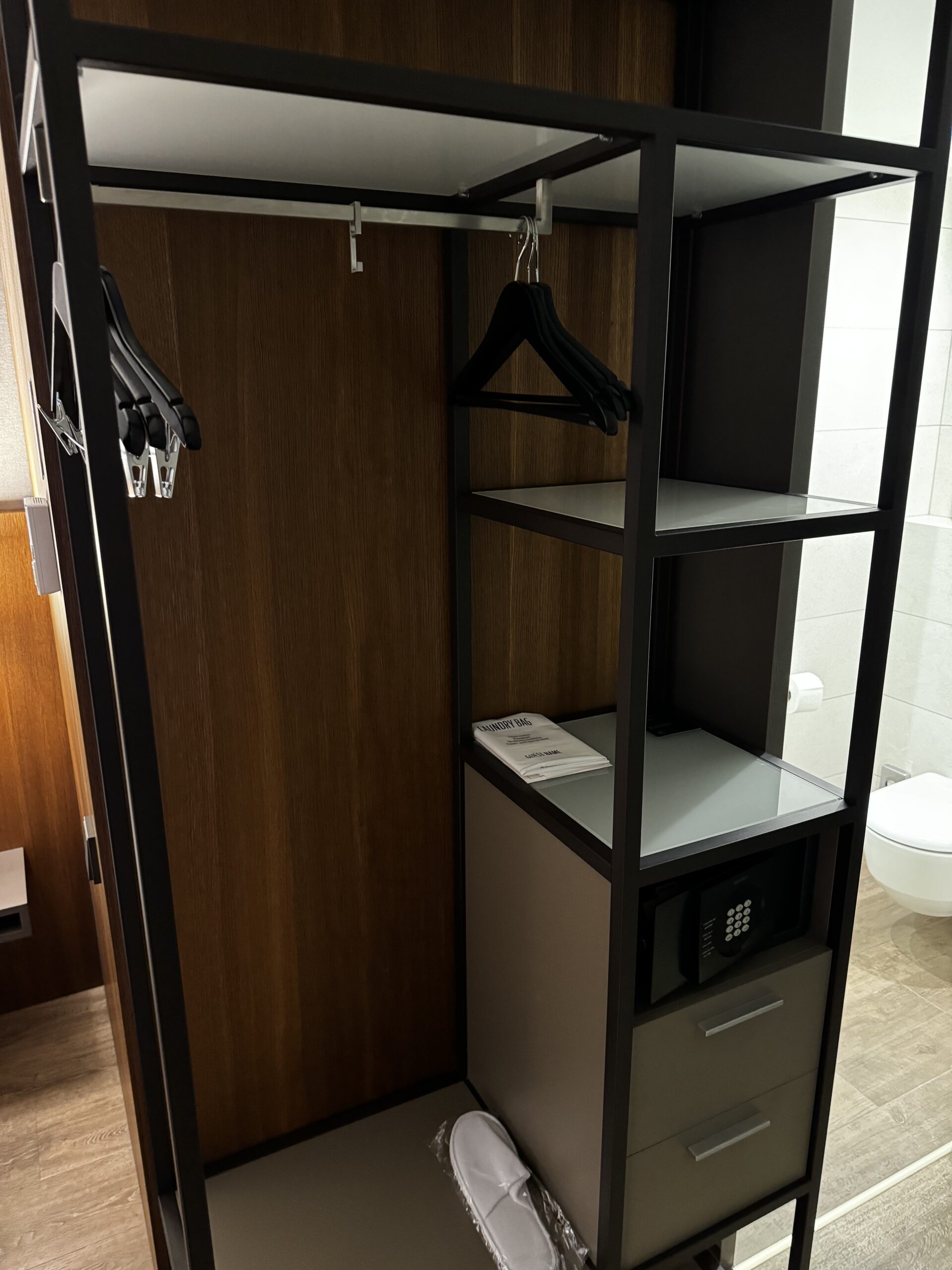 Das Zimmer selbst hat so ein seltsames Regal wo auch ein Safe drin ist und man Kleider aufhängen kann.