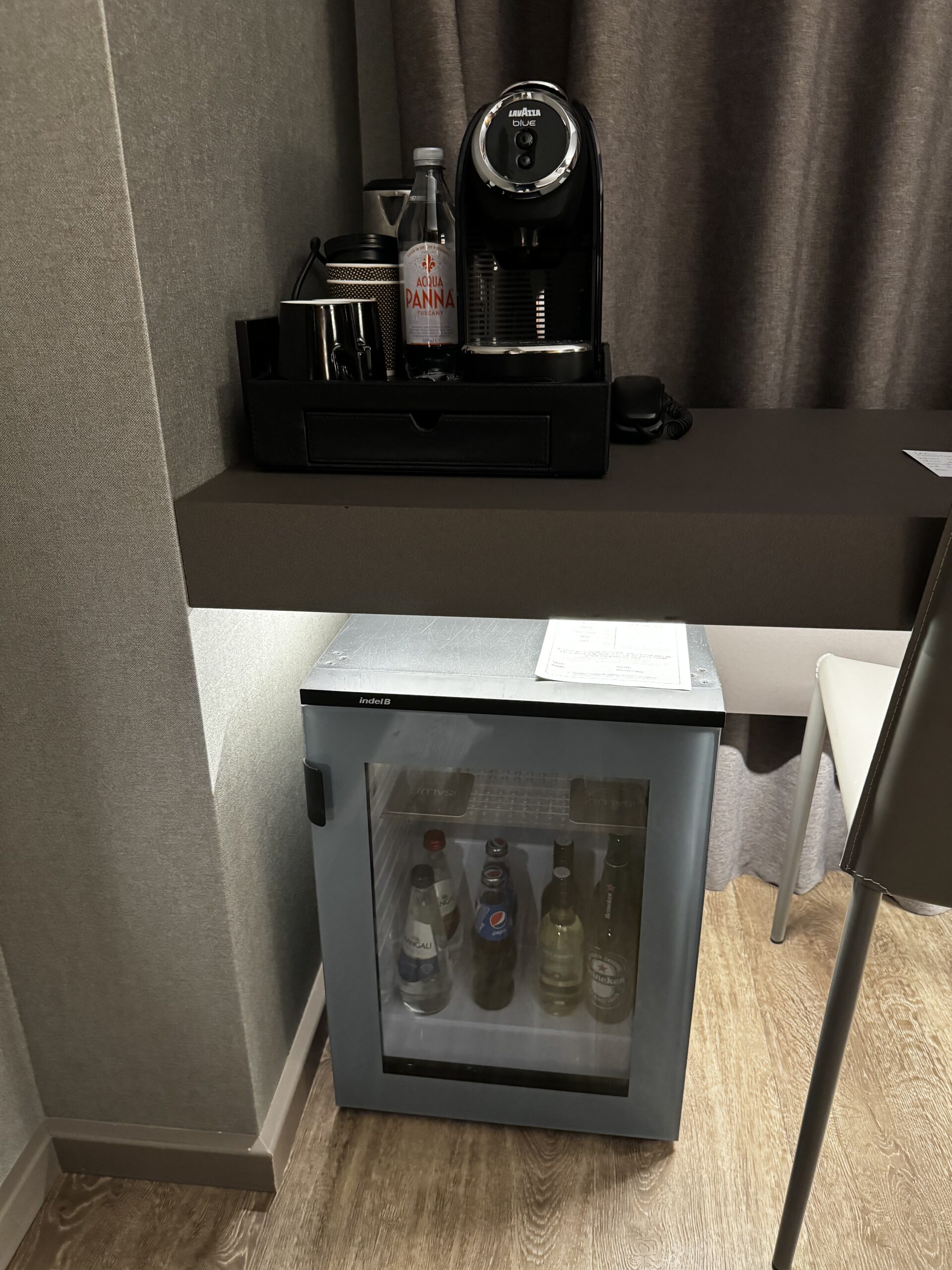Am Fenster hat es noch eine Kaffeemaschine, gratis Wasser sowie eine kostenpflichtige Minibar. Eine Stück Schokolade und eine Karte vom Hotel hat es dort ebenfalls gegeben. Dazu hat man hier noch eine Ablagefläche für das Gepäck.
