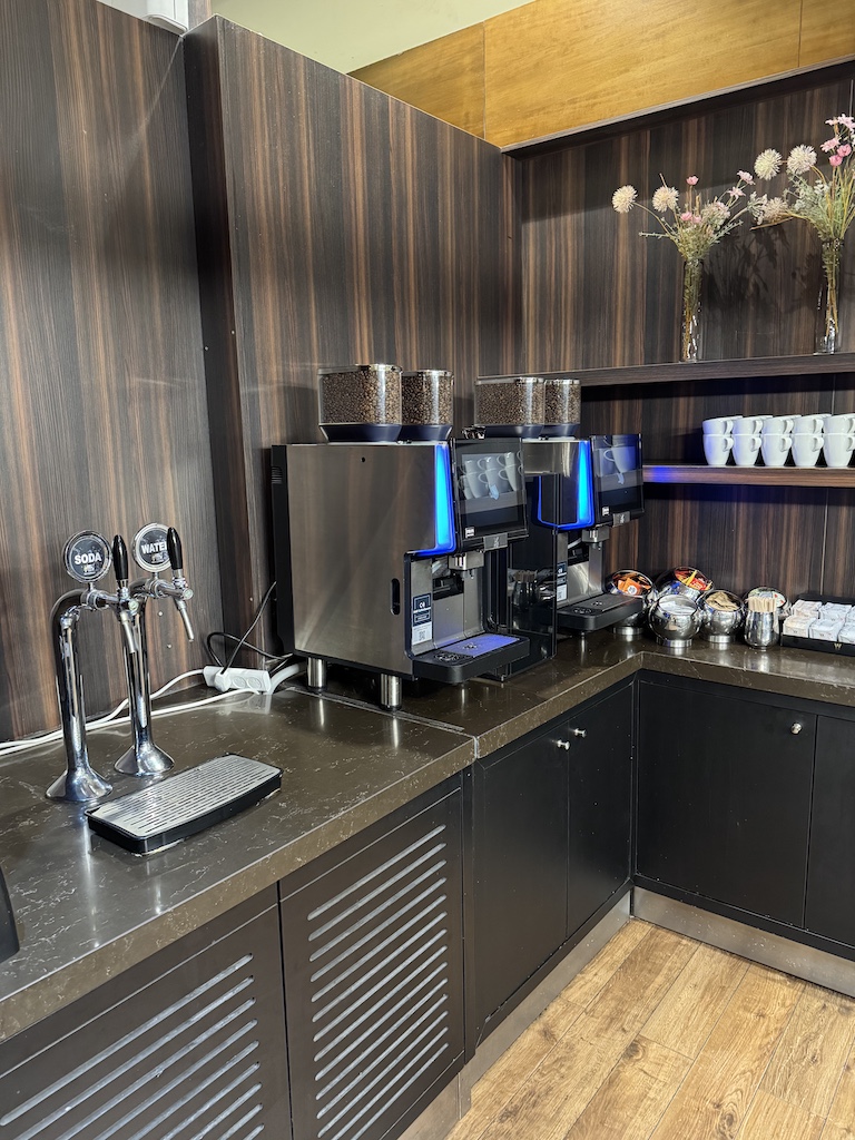 Puh, dies kann ich wohl eher kurz halten, aber dennoch gebe ich mir Mühe dies nicht zu negativ erscheinen zu lassen. Der Raum ist durch unterschiedliche Sitzgelegenheiten aufgeteilt. Auf beiden Seiten hat es eine Kaffeemaschine – sowie auf der linken Seite eine kleine Bar wo Weine ausgeschenkt werden.