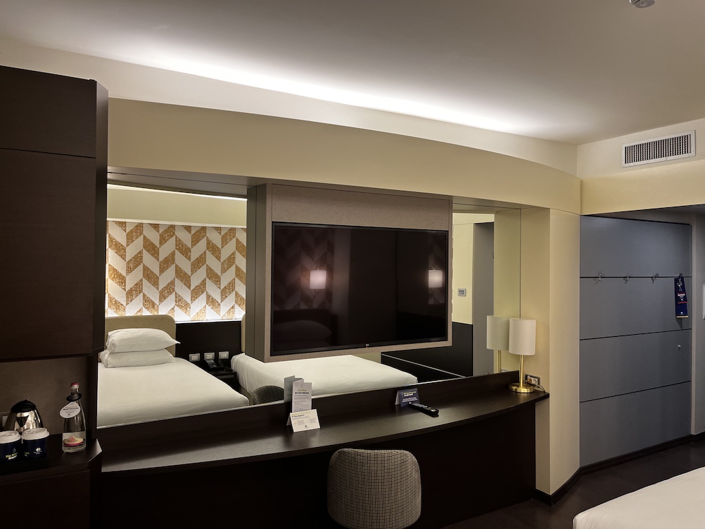 Etwas ärgerlich denn hier scheinen mir einige Bilder zu fehlen, ich begebe mich da noch auf die Suche. Aber: das Zimmer war sehr sauber und das hat mir schon gefallen. Die Grösse war absolut ausreichend und auch auf genügend Steckdosen hat man geachtet. Dazu kam noch eine Flasche Wasser und ich war mehr als zufrieden für den kurzen Aufenthalt.