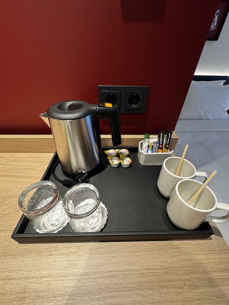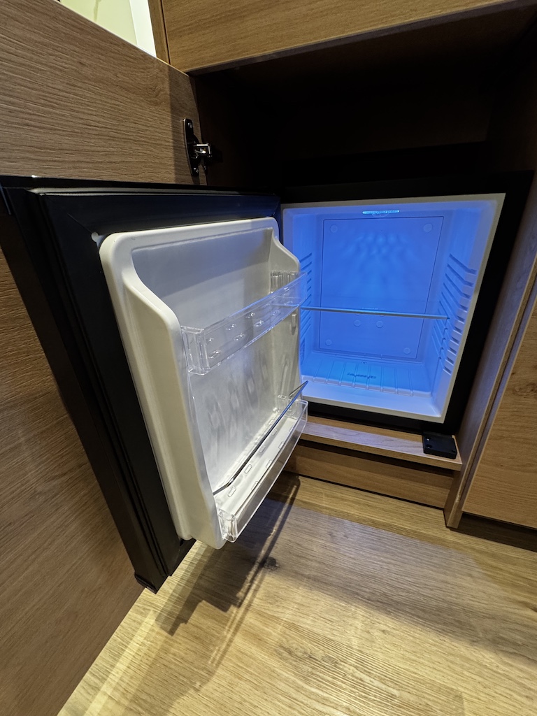 Im Eingangsbereich des Zimmers gibt es wie immer einen Schrank auf denen ein Wasserkocher steht mit dazugehörigen Tee/Kaffee. Eingebaut ist auch ein Safe, Kühlschrank (leer) und Bügeleisen.