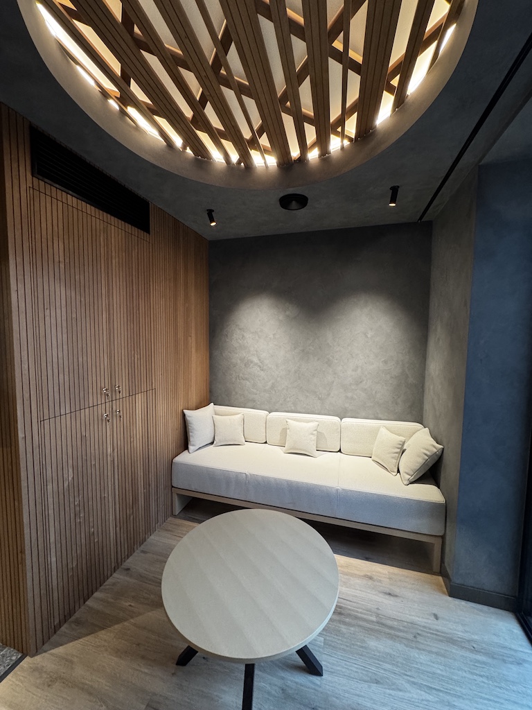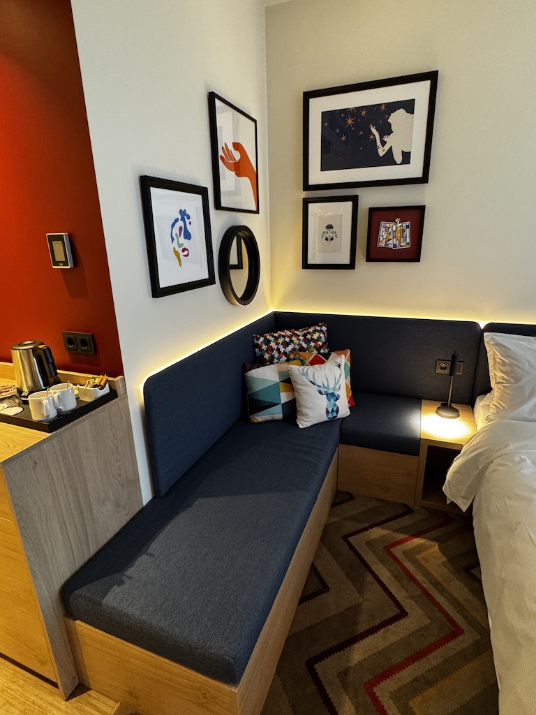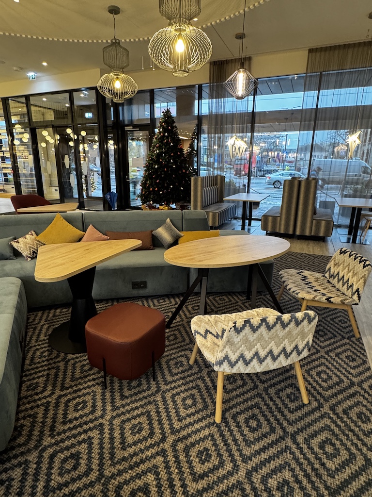 In der Lobby hat es neben dem Empfang eine Bar, aber auch viele Sitzbereiche die manchmal sehr clever und schön abgeschirmt sind. Auch hier hat man an Steckdosen gedacht. Einen separaten Arbeitsbereich mit Computer / Drucker gibt es ebenfalls.