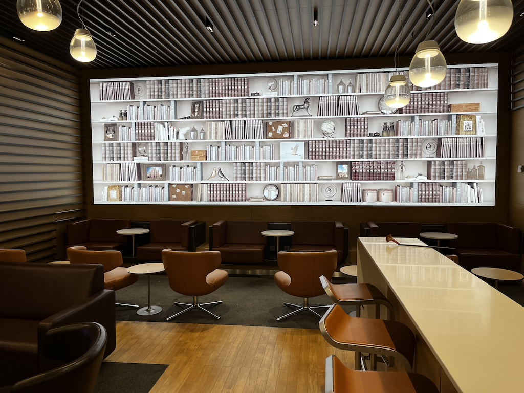 Wie so häufig besteht hier alles aus einem grossen Raum. Nach dem Empfang hat man auf der linken Seite noch einige Tische mit Steckdosen. Weiter hinten hat es dann kleine Bereiche zum arbeiten und weitere Sitze die sehr Lufthansa typisch sind. Um alles aufzuwerten hat man noch versucht eine Buchwand hier einzubauen. Persönlich finde ich es eine gute Idee da es alles ein wenig aufbessert und hochwertiger wirken lässt.