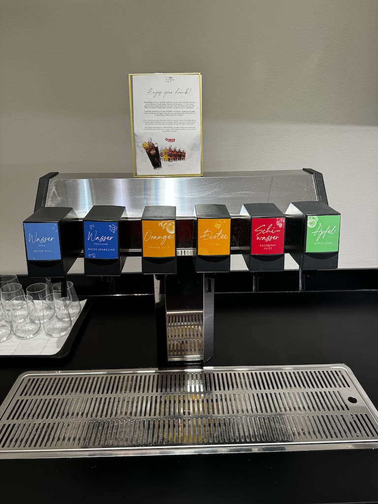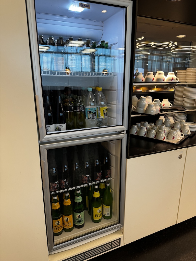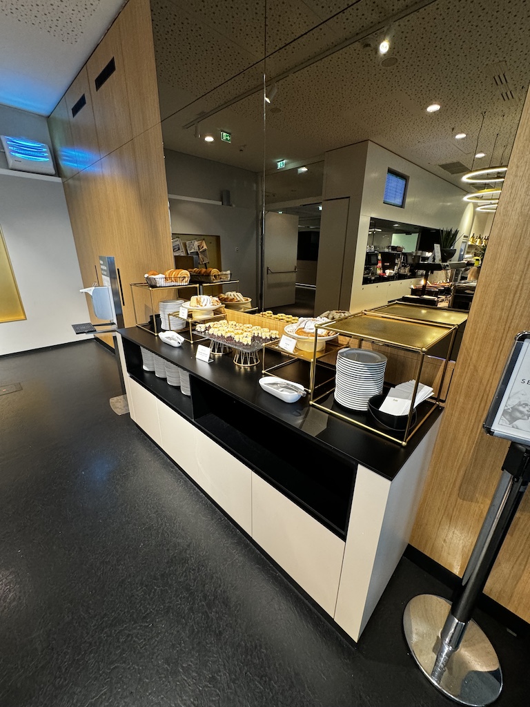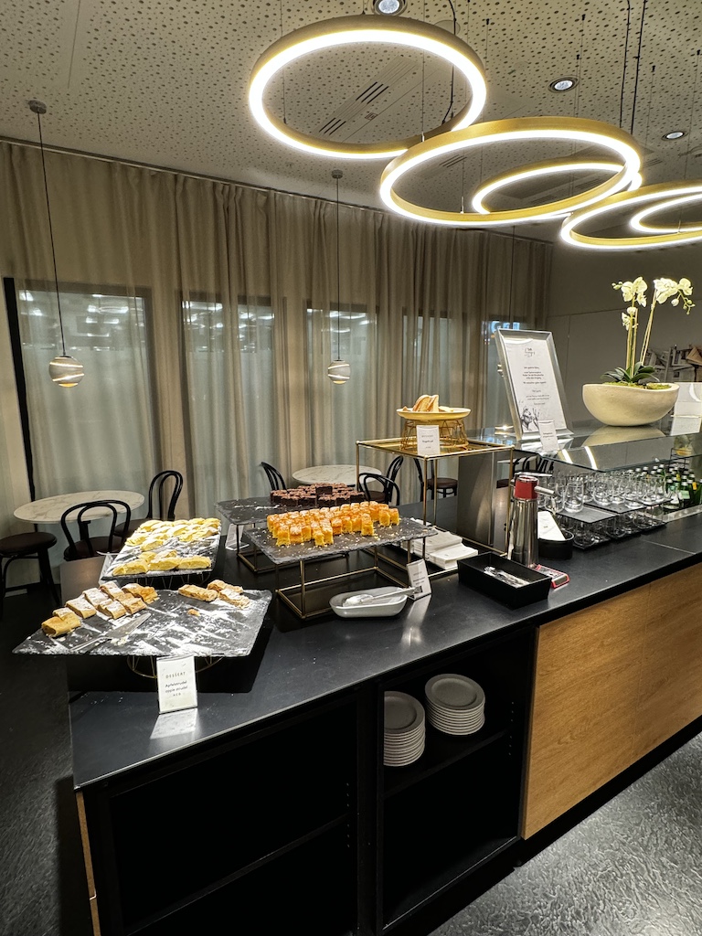 Auf der rechten Seite hat es in einem Nebenraum in dem man das Speise und Getränkeangebot findet. Es hat dort ebenfalls die Möglichkeit sich hinzusetzen und an eine Tisch zu essen. Die Auswahl fand ich recht gut bei meinem Besuch. Ich muss sagen es sah teilweise besser aus als in der Austrian HON Lounge nebenan, aber das ist meine persönliche Meinung.
