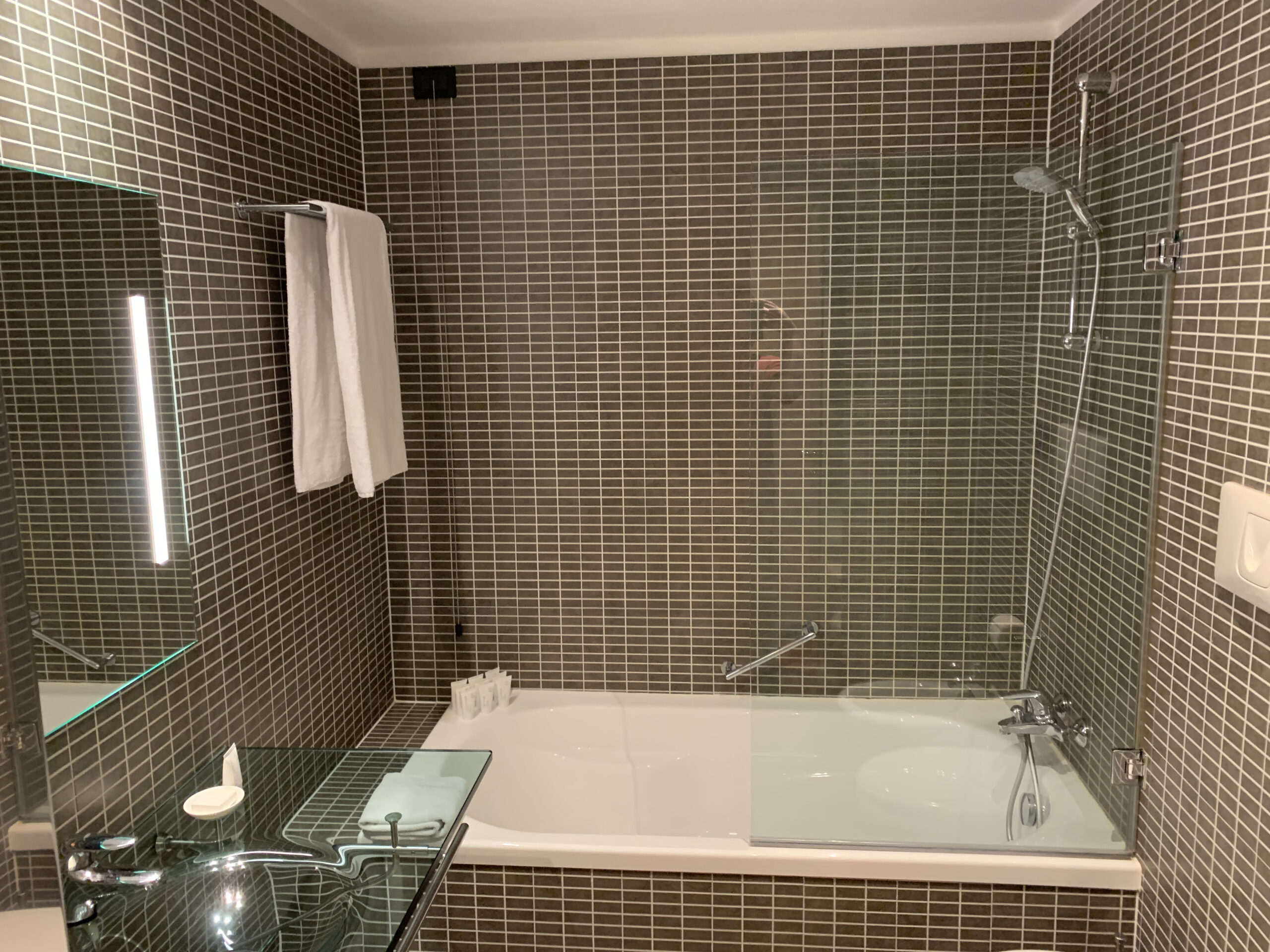 Der grösste Teil des Zimmers wird durch das Bett eingenommen, es hat einen Schreibtisch mit einem guten Stuhl sowie eine gute Ablagemöglichkeit für das Gepäck. Leider verstehe ich nicht warum alle Steckdosen am Schreibtisch unter dem Schreibtisch angebracht sind. Dies ist einfach nicht zeitgemäss, auch gibt es am Bett insgesamt lediglich eine Steckdose. Auf der anderen Seite hat es noch einen doch recht grossen Fernseher.