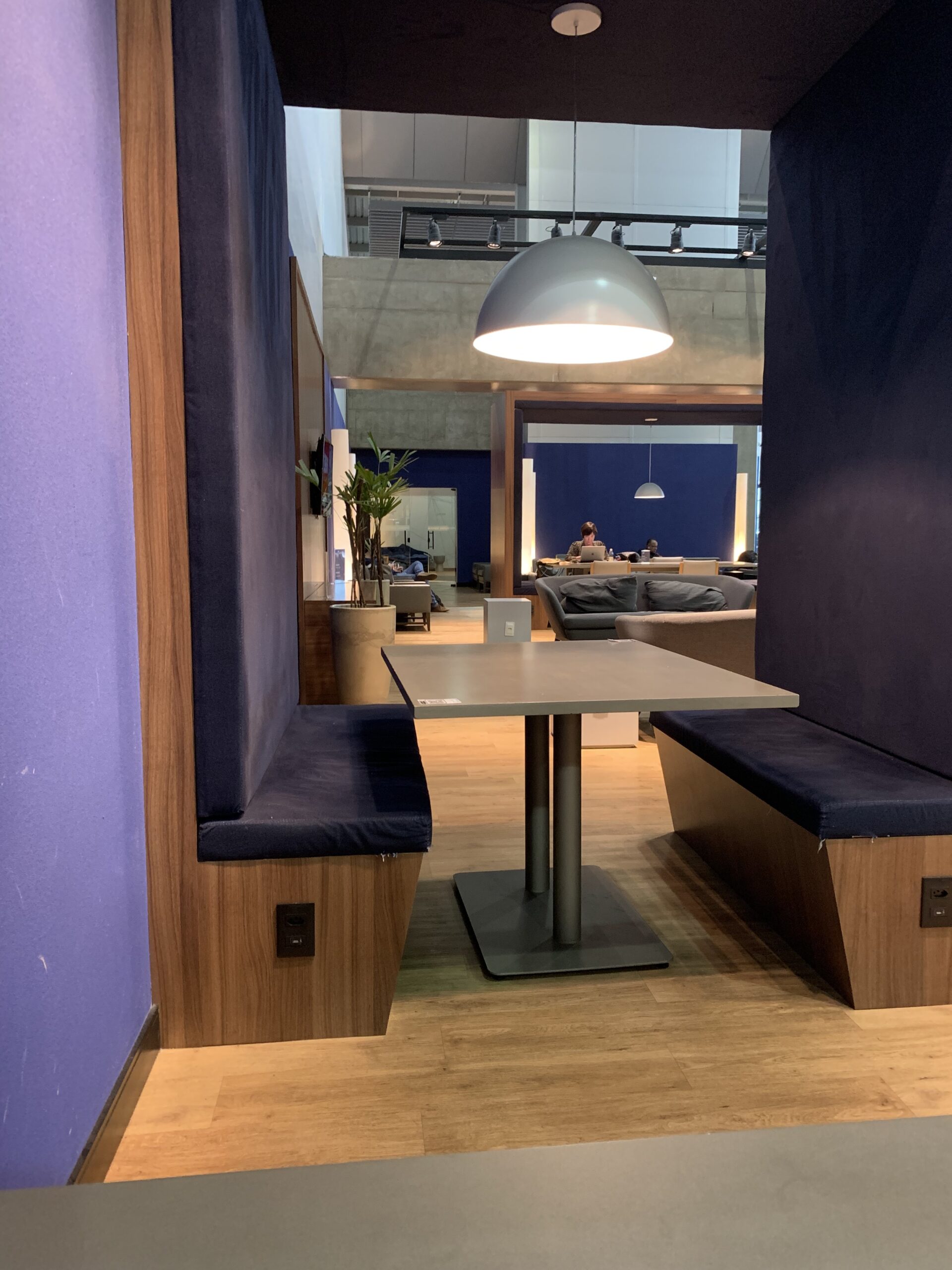 Es hat unterschiedliche Sitzecken die gut in der Lounge verteilt sind. Der grösste Teil davon hat auch ausreichend Steckdosen. Für mich wirkt dies alles sehr modern und ist eine angenehme Abwechslung zu den anderen Lounges.