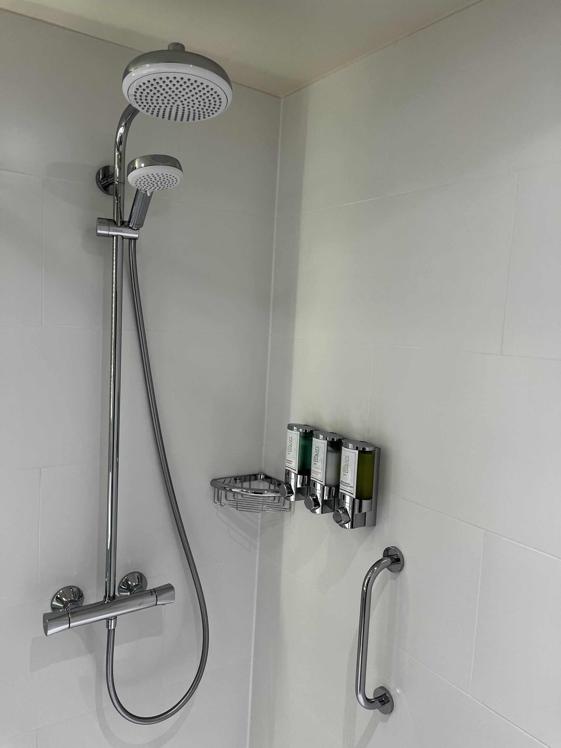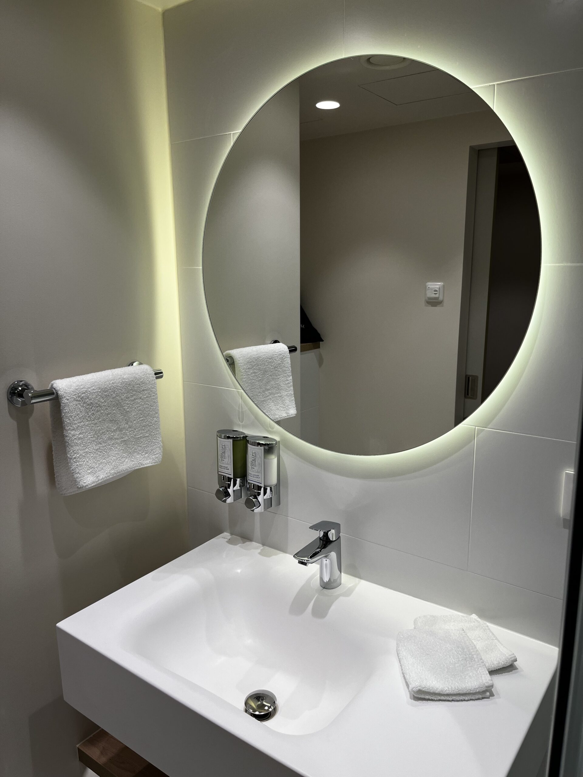 Um es klar zu stellen, wir reden hier Über ein Hampton by Hilton – aber das Zimmer fand ich wirklich sehr gut. Auf der linken Seite befindet sich das Badezimmer. Dort hat es alle nötigen Pflegemittel in diesen umweltfreundlichen Dispensen (wovon ich zugegen nicht so der Fan bin)