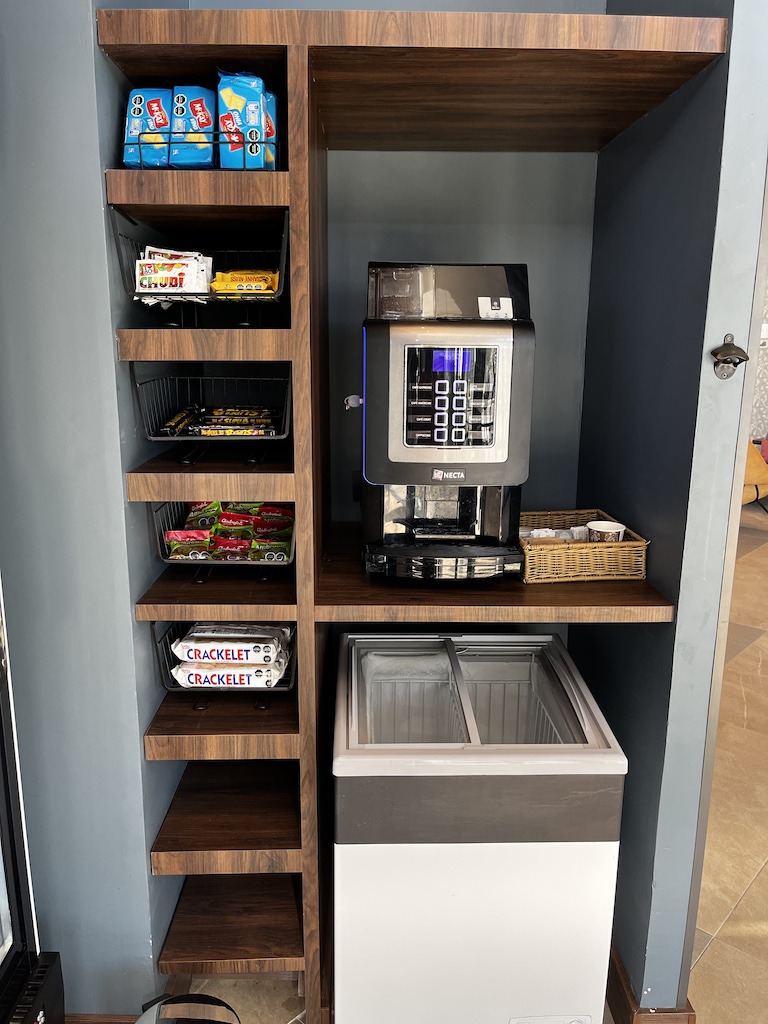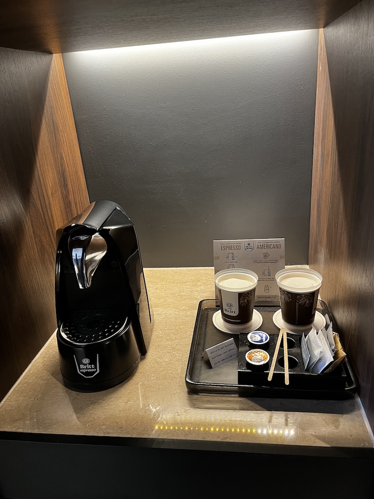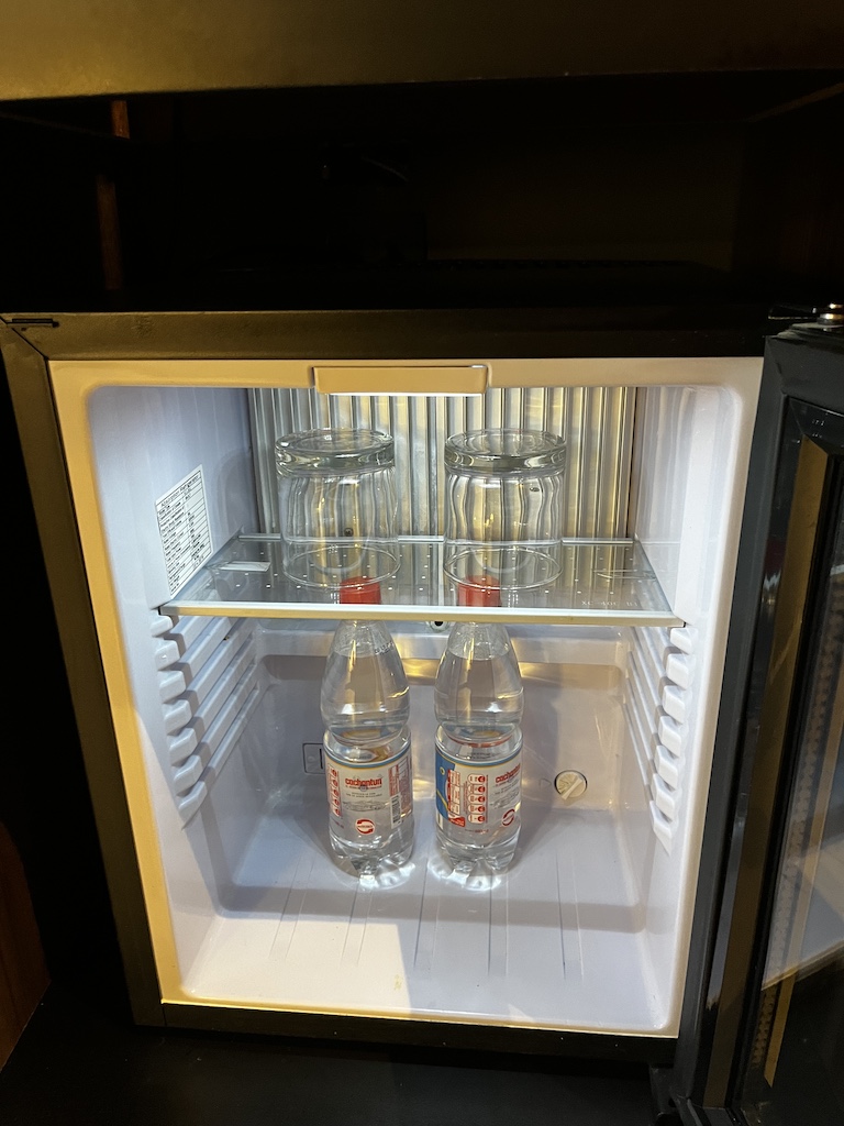Dann dicht gefolgt von der Minibar (mit zwei gratis Flaschen Wasser und Gläsern), darüber dann eine Kaffeemaschine mit zwei Kaffeekapseln. Wenn man mehr haben möchte, dann kann man diese für COP 1500 bestellen.