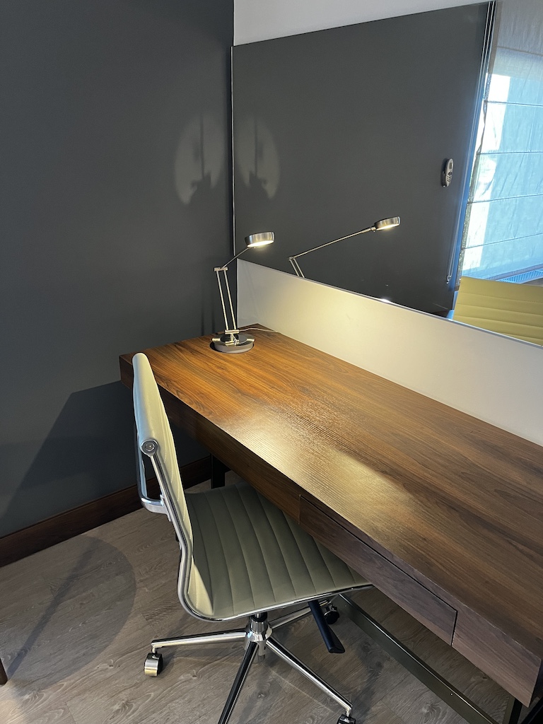 Es ist sehr schlicht gehalten, aber für meine Zwecke geeignet. Wenn ihr ins Zimmer kommt, dann ist auf der linken Seite das Badezimmer und vis a vis noch ein Schrank mit Safe und Bügelbrett.