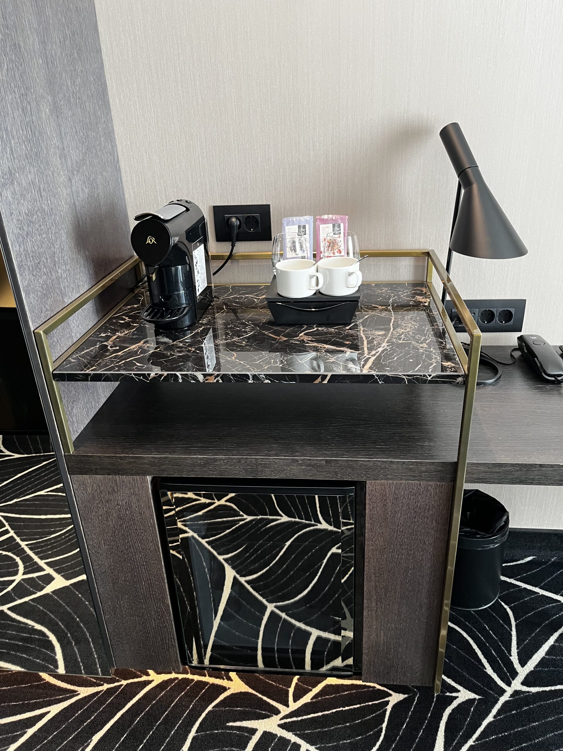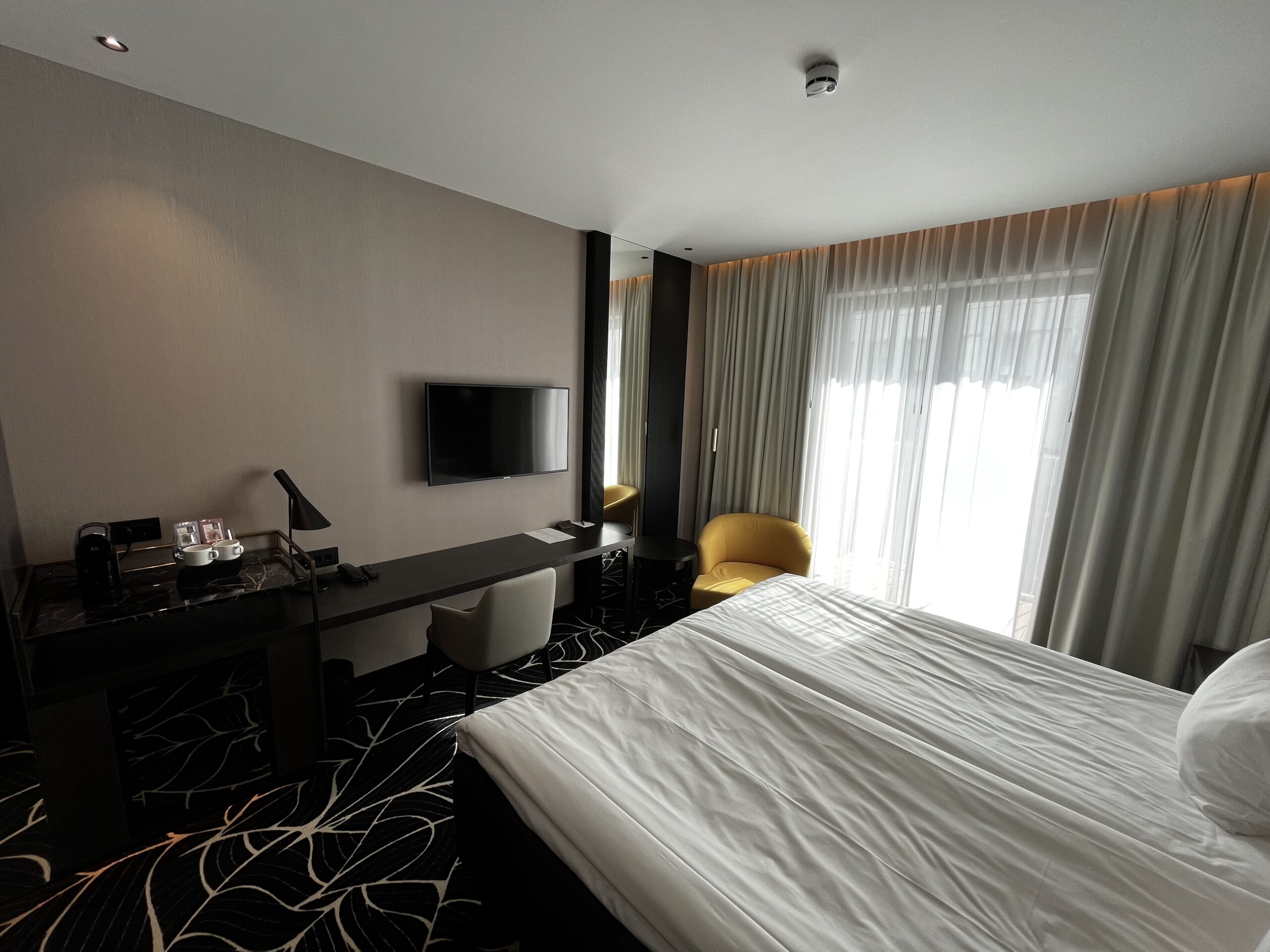 Das Bett nimmt den grössten Bereich ein, es hat auch genügend Steckdosen im Zimmer verteilt. Und was mich als Kaffee Fan erfreut hat, es hat auch eine Kaffeemaschine im Zimmer.