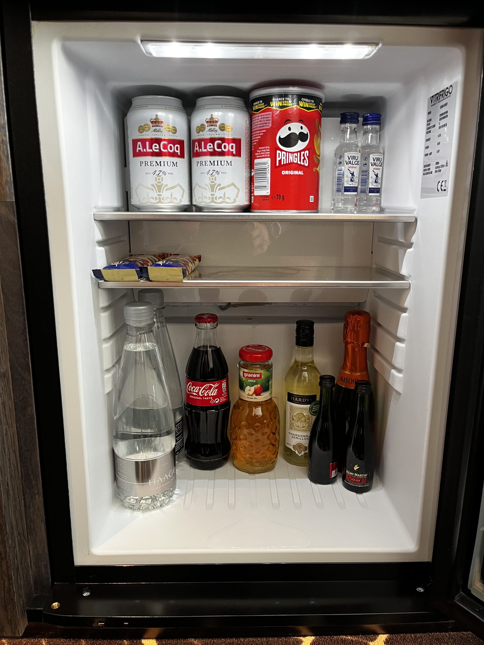 Im Eingangsbereich befindet sich eine Kofferablage, dann auf der rechten Seite das Badezimmer. Die Minibar ist ebenfalls vorhanden und gut gefüllt. Naja über die Preise lässt sich bekanntlich streiten.