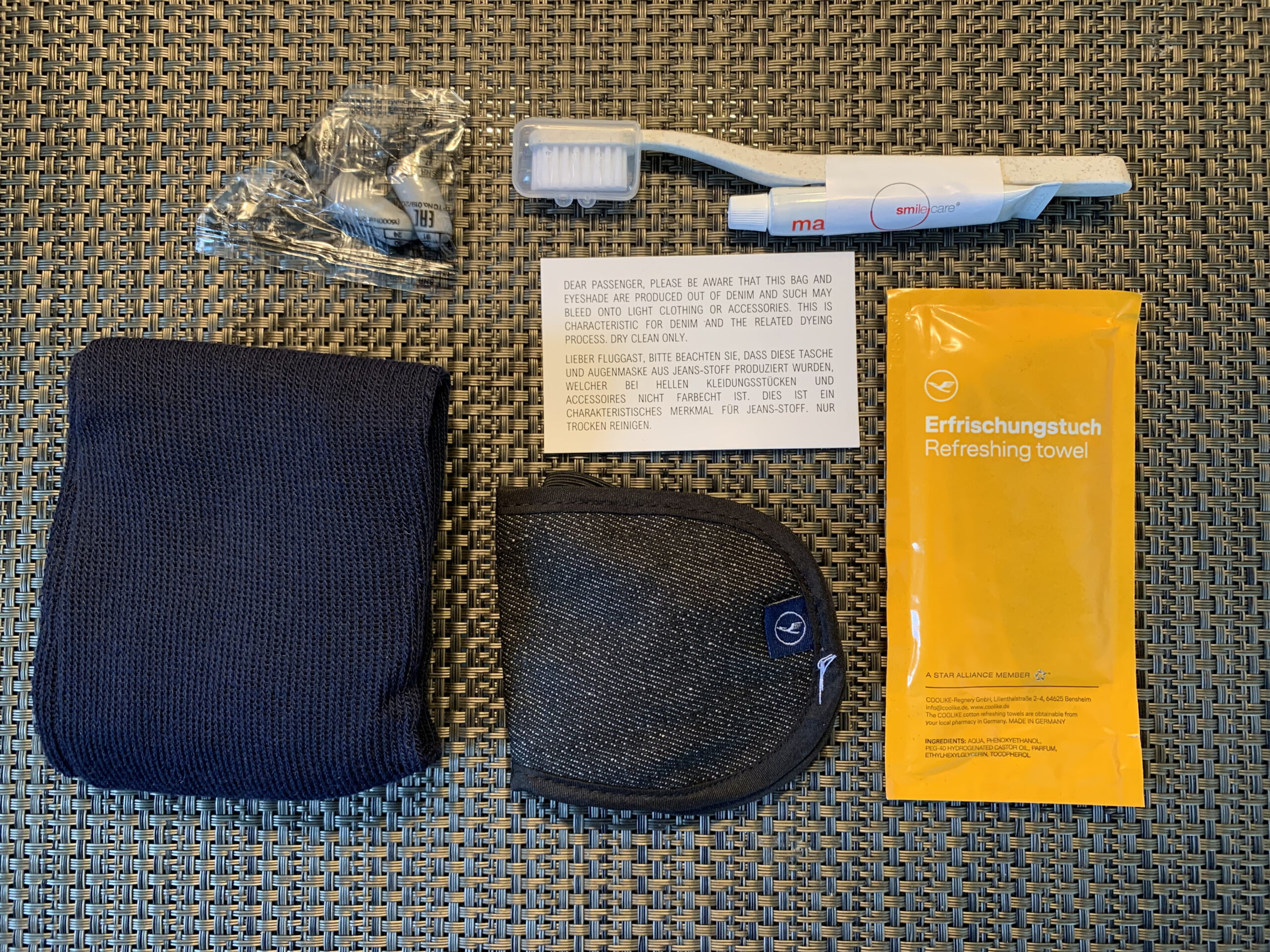 Ein nettes Amenity Kit was die Lufthansa hier bietet. Man muss allerdings auch die Warnung mit dem Jeansstoff beachten, ansonsten könnte es eine böse Überraschung geben.