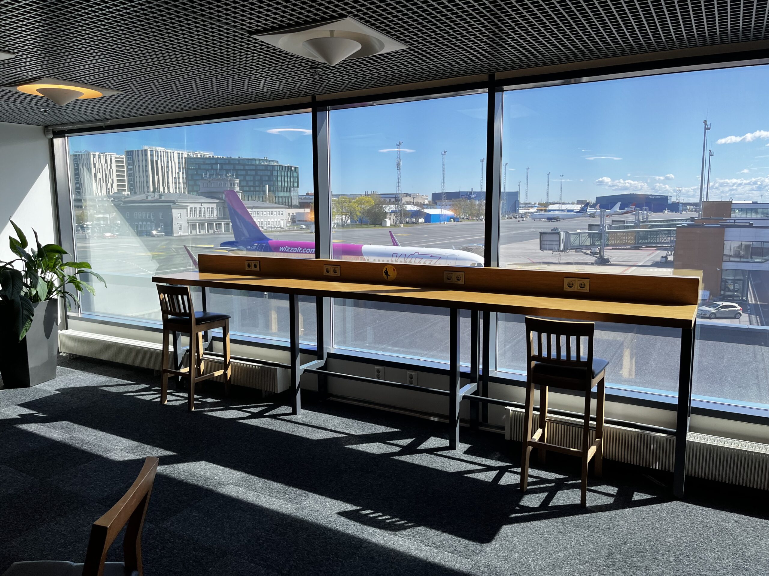 Die Aussicht auf das Vorfeld ist sehr schön, hier hat es auch an den Stehtischen genügend Steckdosen, die sind ansonsten dann doch eher Mangelware.