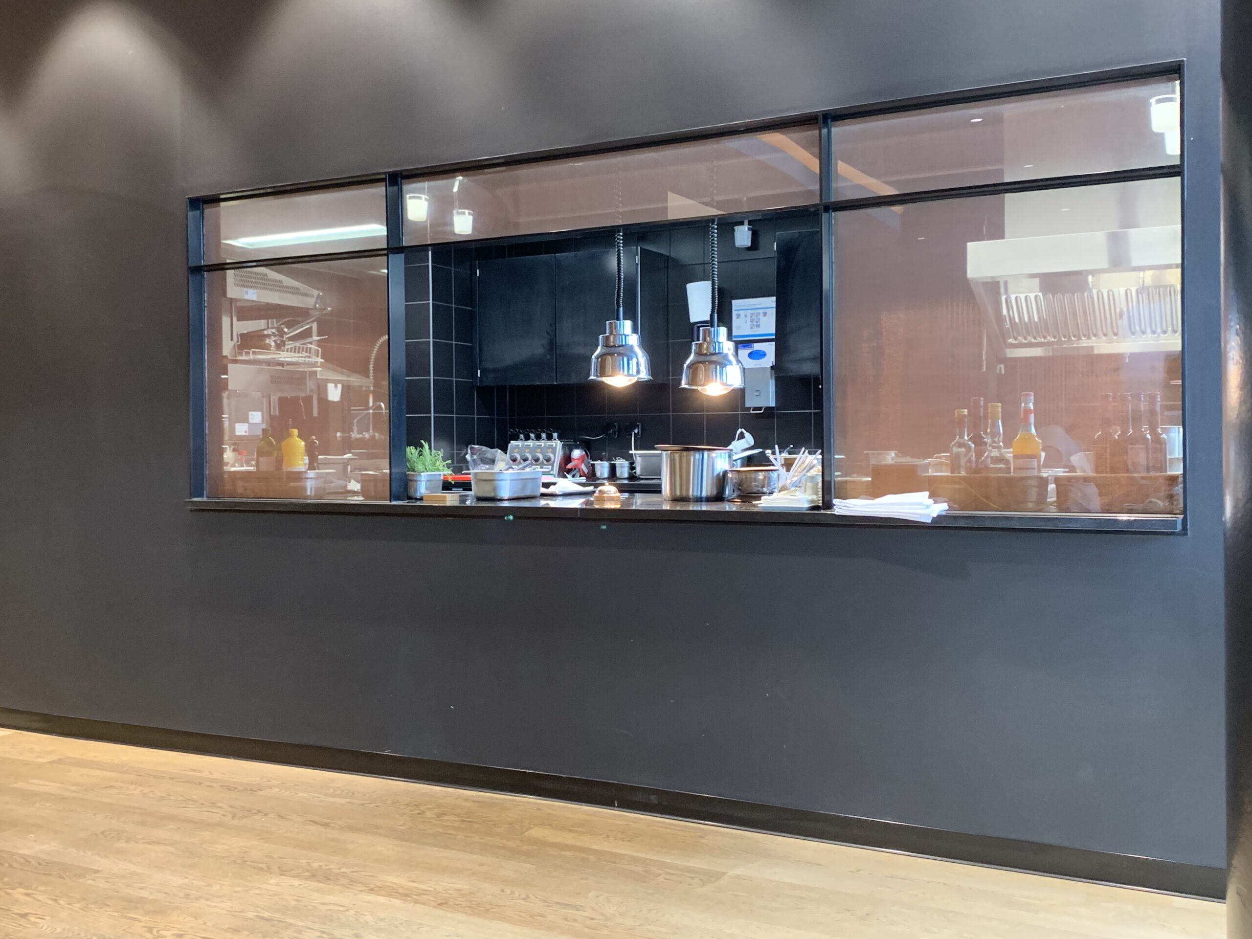 Wie zu sehen ist, ist die Küche so gestaltet, dass man auch sieht was dort vor sich geht. Daneben hat es dann noch Kühlschränke mit kleinen Snacks und verschiedenen Getränke zur Selbstbedienung.