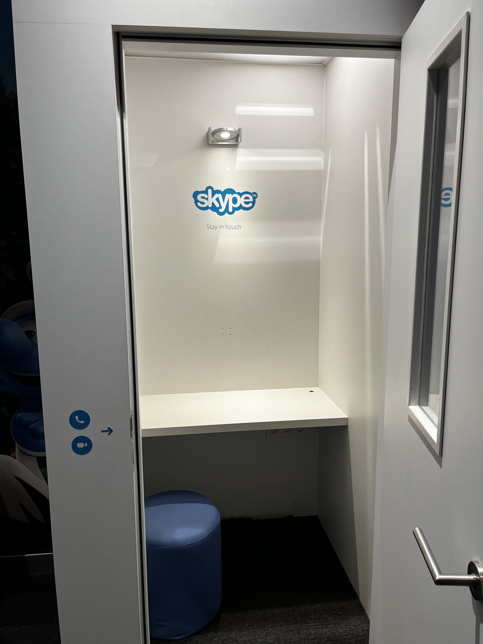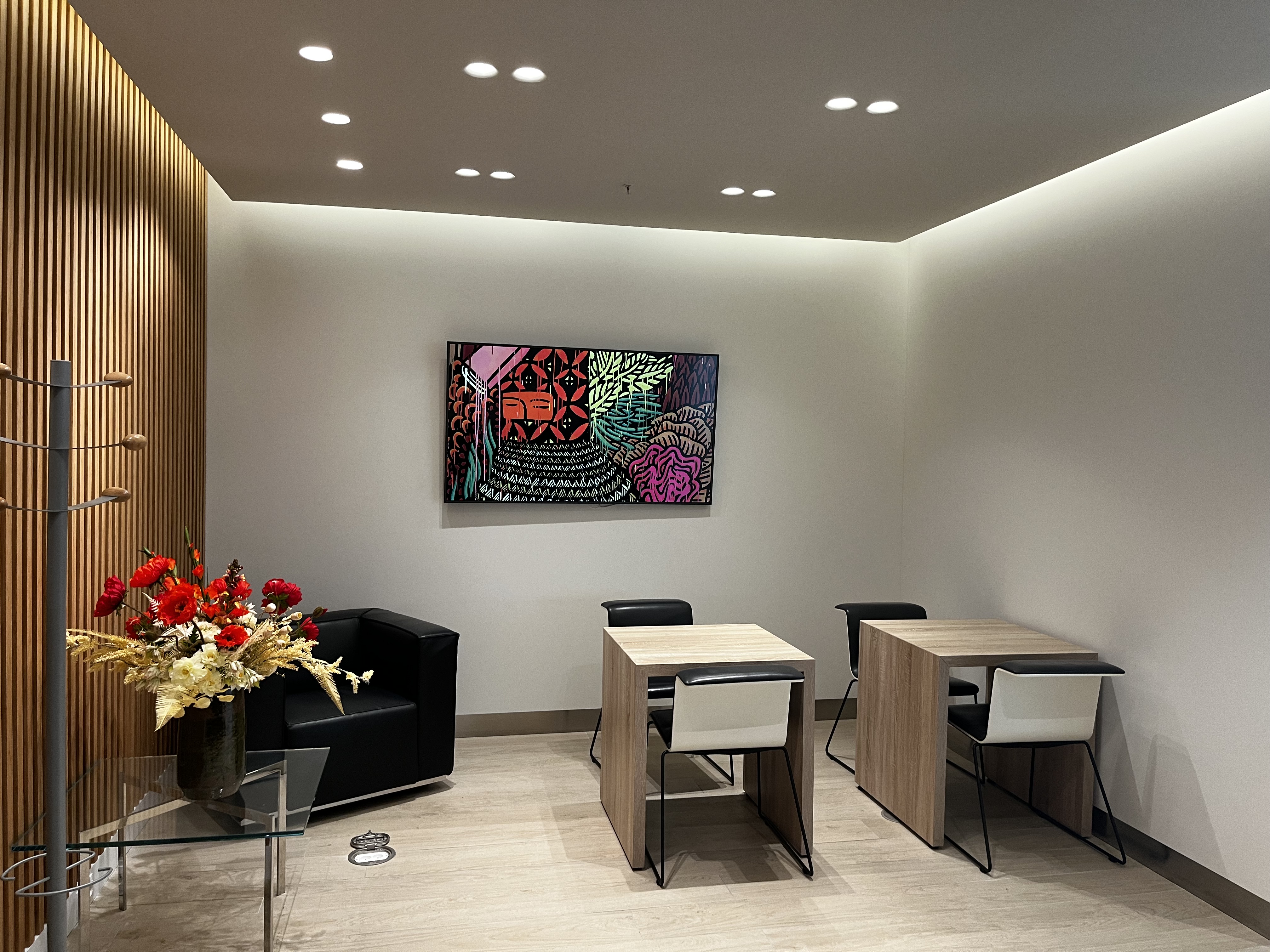In der Lounge gibt es eine Art Wohnzimmer mit einem grossen Bildschirm.
