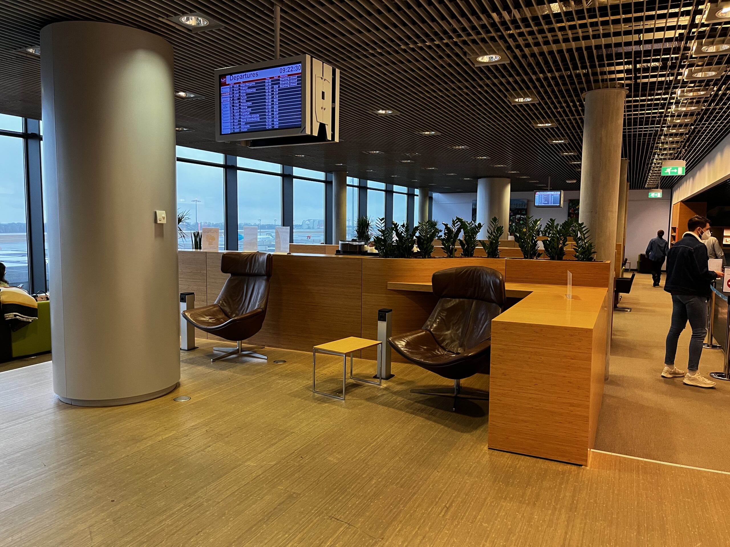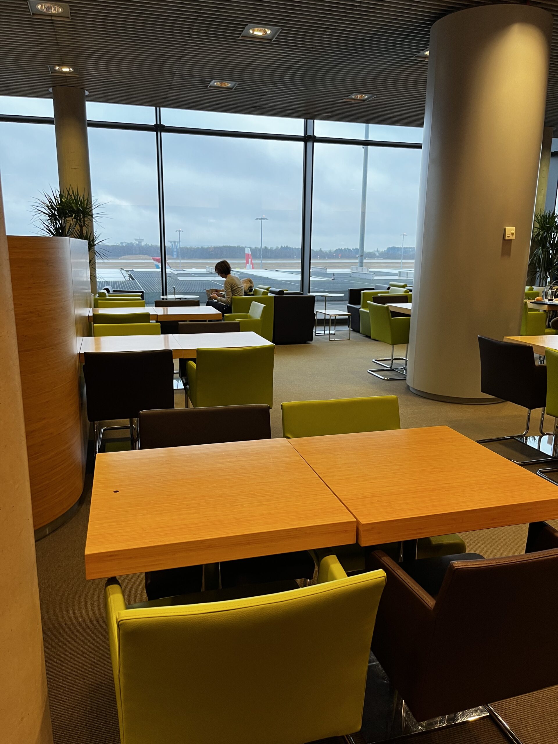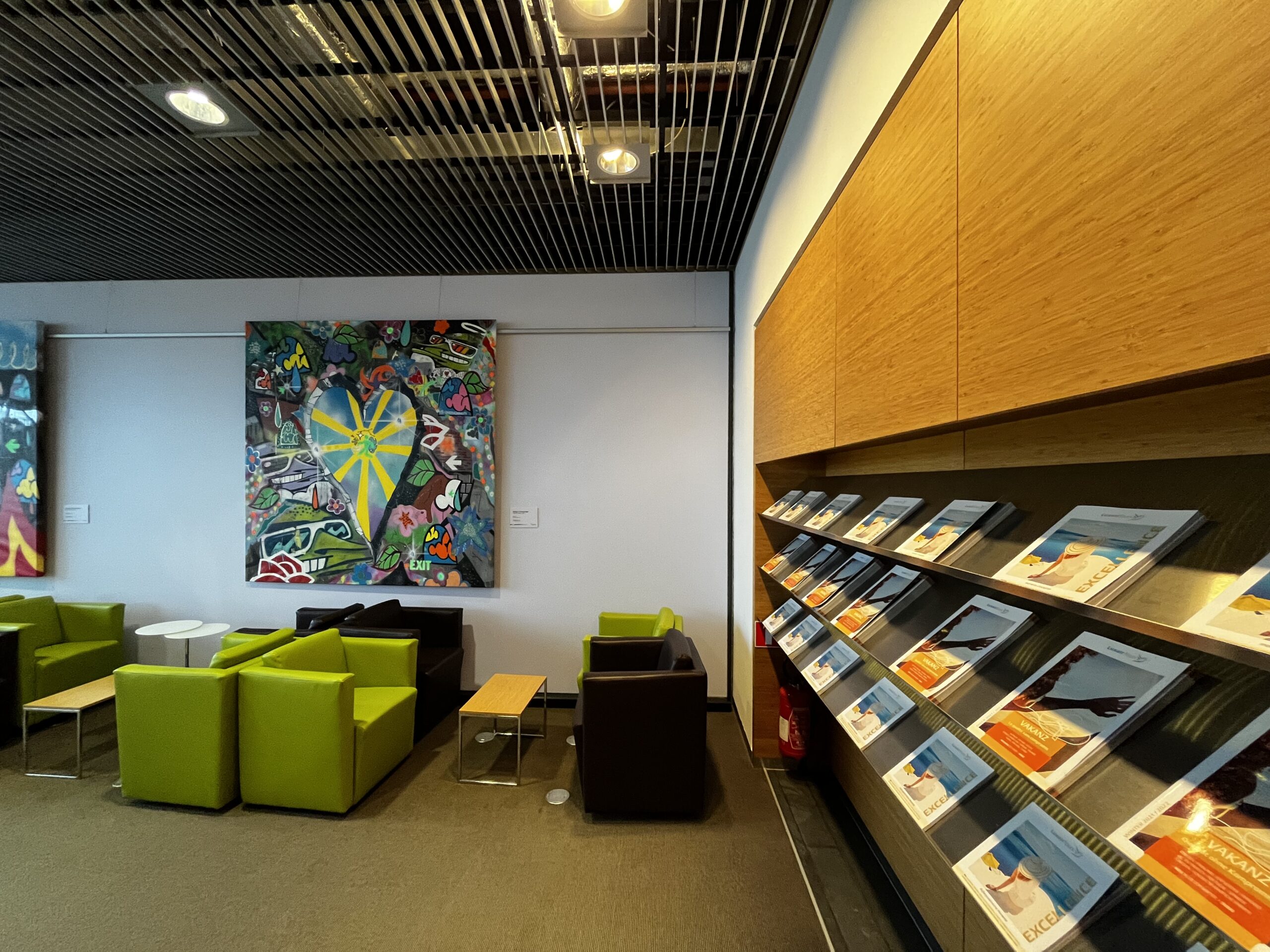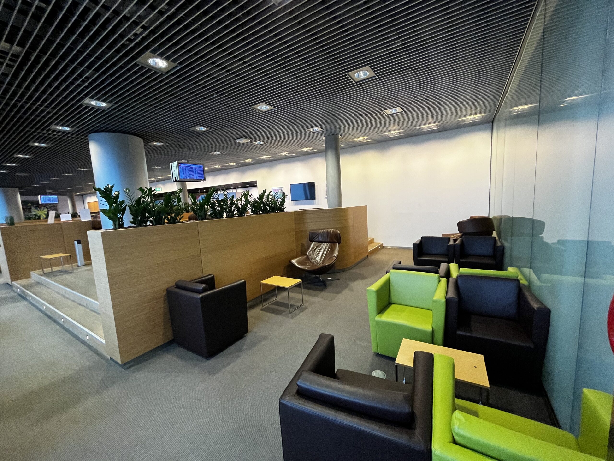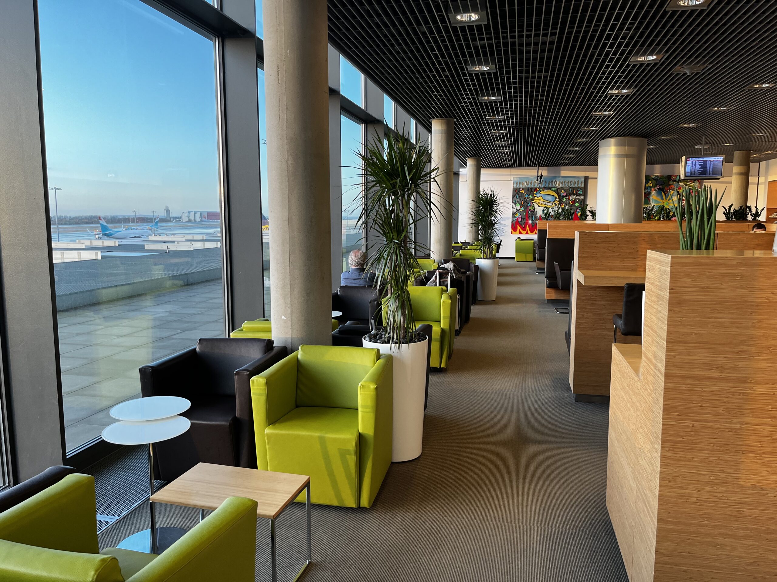 Grundsätzlich ist es ein grosser Raum mit unterschiedlichen Sitz- Arbeits- und Loungemöglichkeiten. Über die Farbwahl lässt sich streiten, aber dafür hat man eine tolle Aussicht auf das Vorfeld was das Vielfliegerherz höher schlagen lässt.