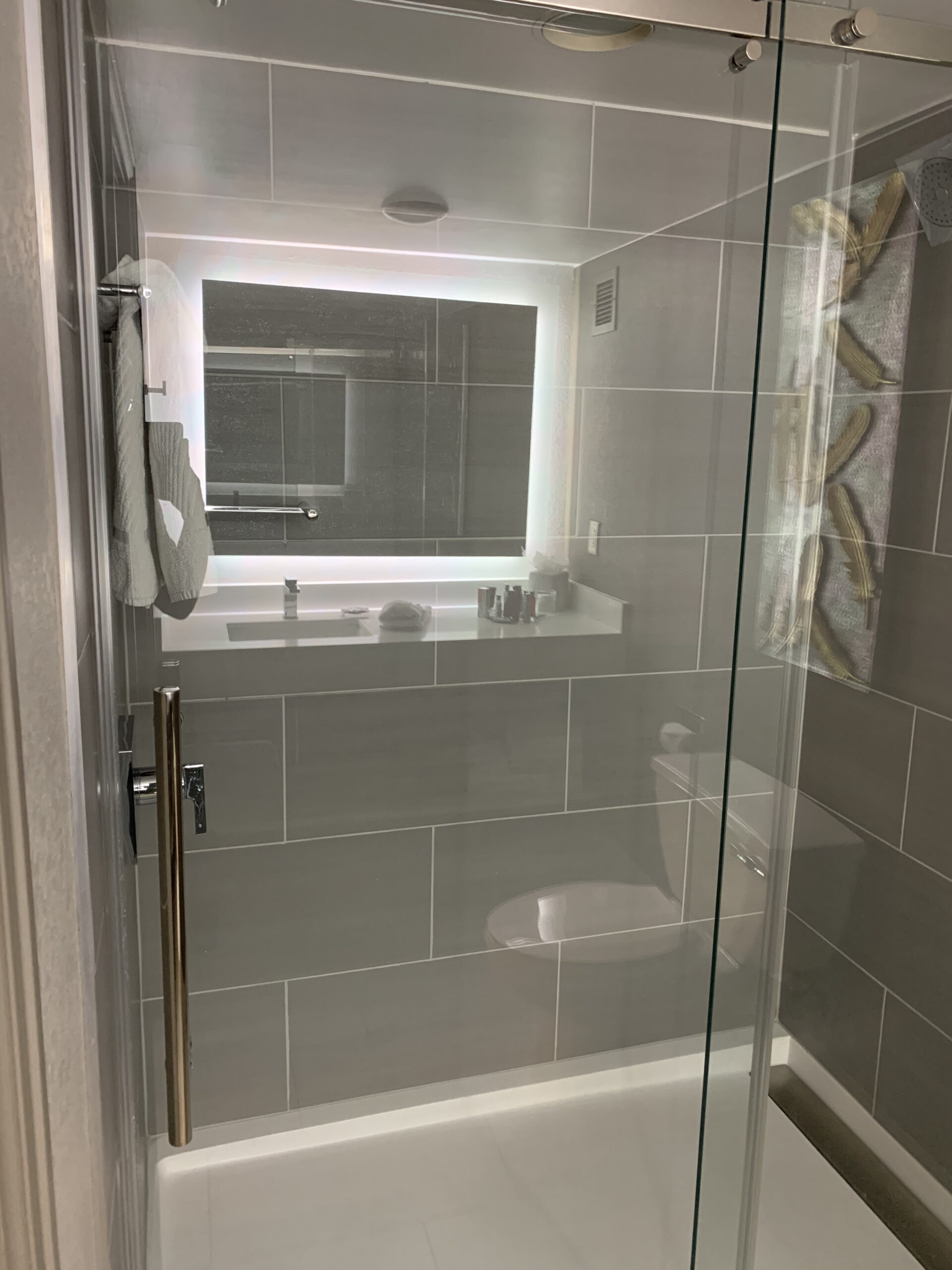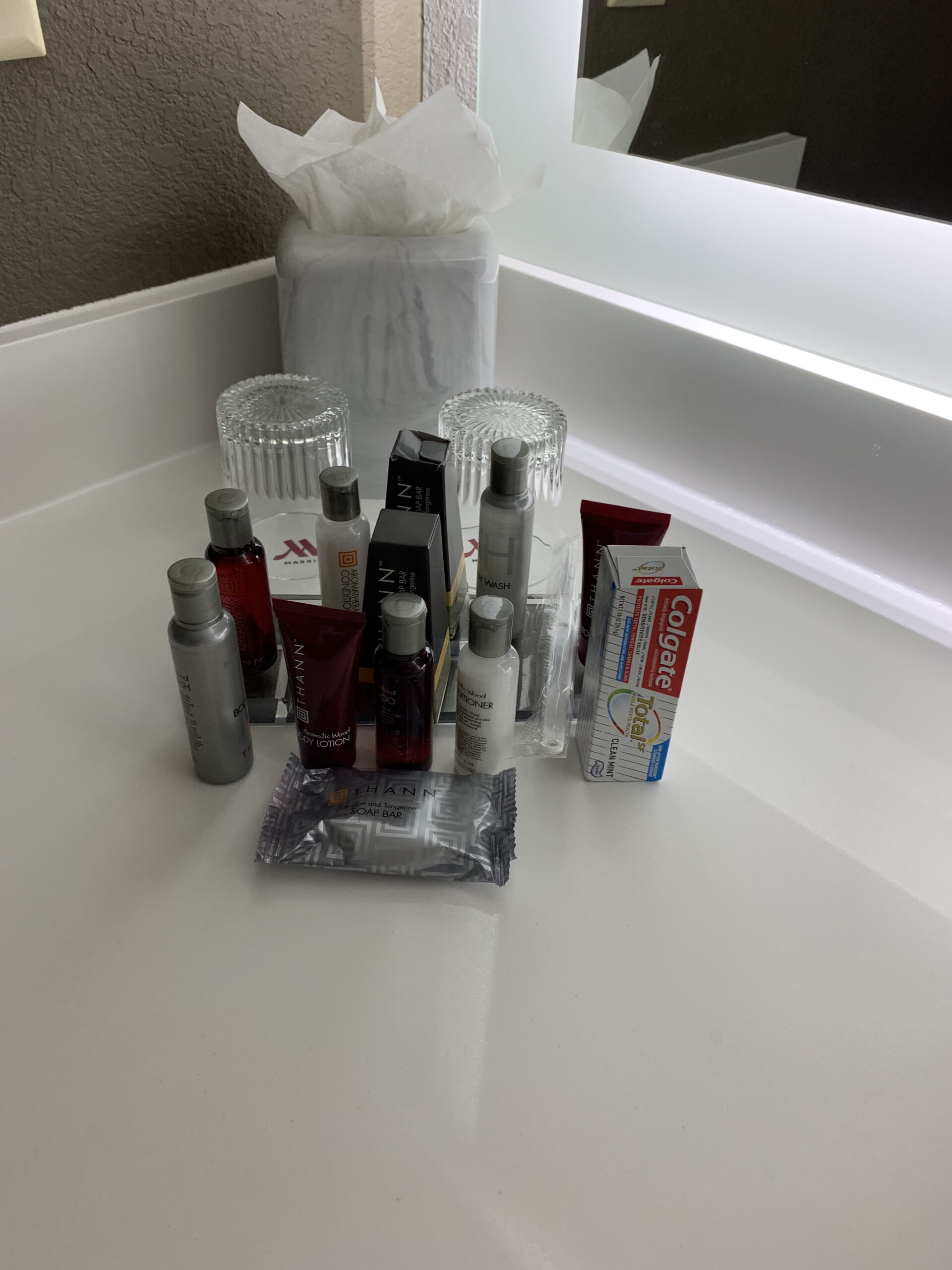 Badezimmer mit den Amenties von Marriott – inklusive Zahnpasta
