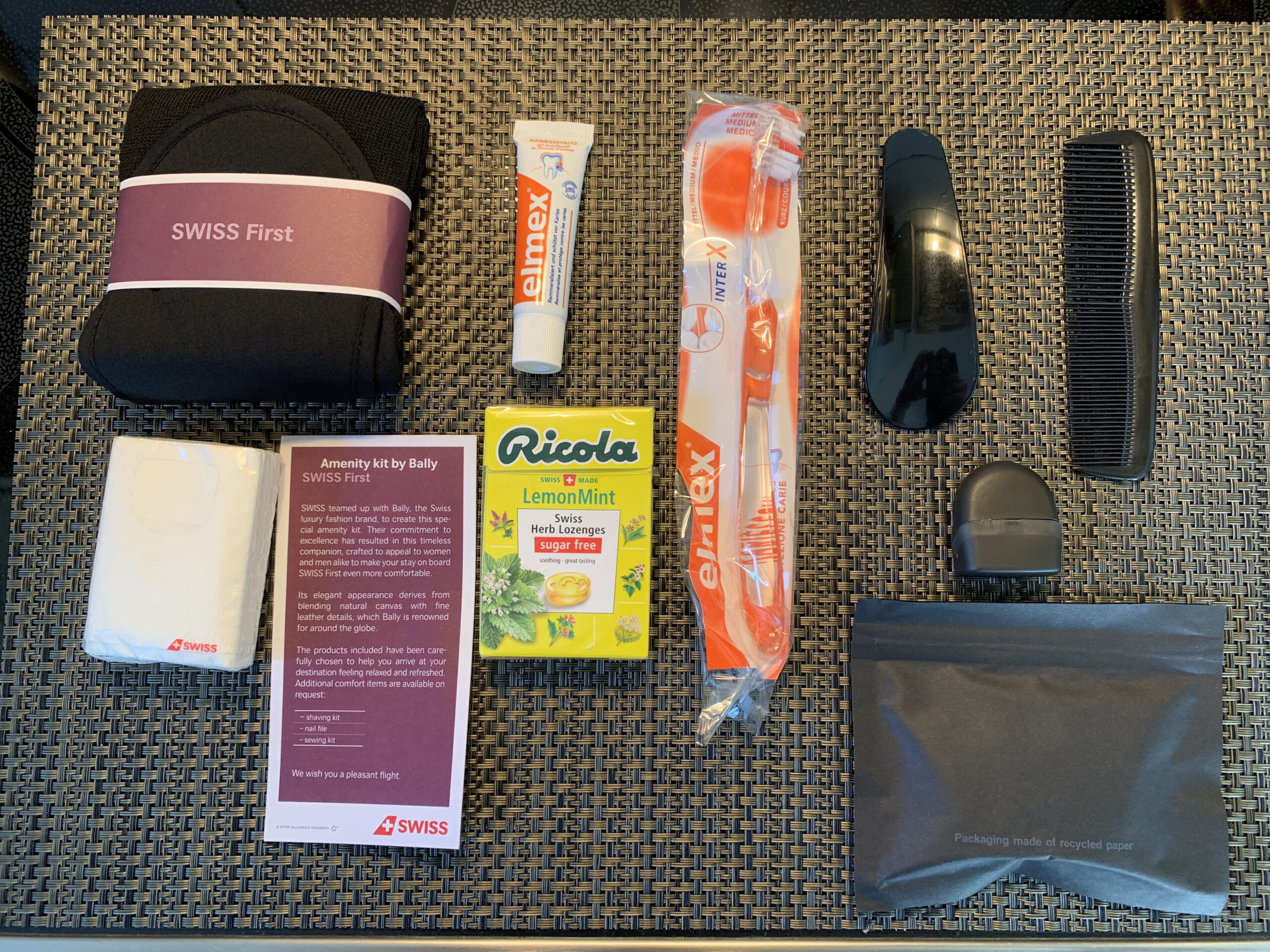 Die Swiss arbeitet seit einer gefühlten Ewigkeit mit Bally für ihr First Class Amenity Kit zusammen und es kommt erstmal eher unscheinbar in einem Sack daher. Darin verbirgt sich dann aber das richtige Amenity Kit in einem netten und doch hochwertigen Bally Tasche. Beim Inhalt achtet die Swiss schon auf die Swissness, daher findet man auch zum Beispiel Ricola oder la prairie Cremen im Amenity Kit.